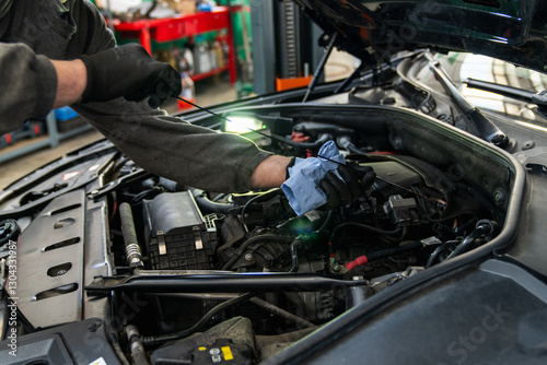 © scharfsinn86, Fototapeta premium Serviceman checks the oil level in a car engine