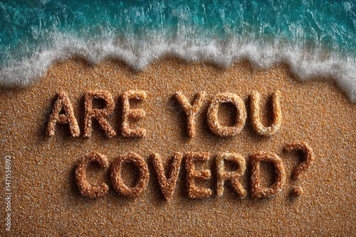 © Generative AI, Fototapeta premium Sesame seed snack letters spelling 'Are you covered?' on sandy beach with ocean wave above. : Generative AI