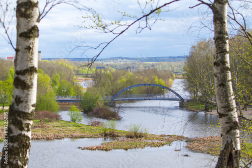 Fototapeta premium Sestroretsky public park and bridge over river Sestra at spring in Klin town,...
