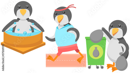 © Дмитрий, Obraz premium Set Abstract Collection Flat Cartoon Different Animal Penguins Throws Out The Trash, Enjoying In The Jacuzzi, Athlete Running On The Track Vector Design Style Elements Fauna Wildlife