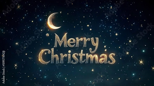 Naklejka premium Set against a dark, starry sky with Merry Christmas in bright, sparkling white letters, surrounded by twinkling stars and a glowing crescent moon.