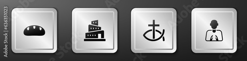 Obraz premium Set Bread loaf, Babel tower bible story, Christian fish and Hands in praying position icon. Silver square button. Vector
