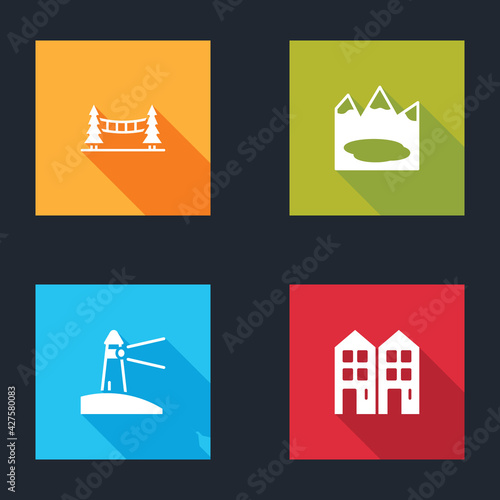 Fototapeta premium Set Capilano Suspension Bridge, Canadian lake, Lighthouse and House icon. Vector