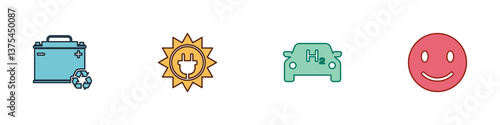 Fototapeta premium Set Car battery with recycle, Solar energy panel, Hydrogen car and Smile face icon. Vector