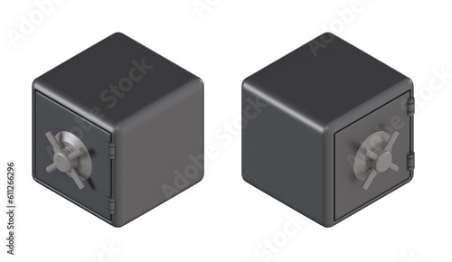 © cgterminal, Fototapeta premium Set closed empty metallic bank safe isolated on white background. Collection objects isometric view. 3d realistic illustration.