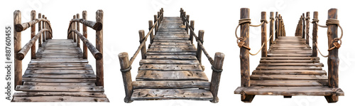 © Sandra Chia, Obraz premium Set collection of arch rustic wooden wood suspended rope suspension bridge entrance footbridge boardwalk on transparent cutout PNG file. Many different assorted style. Mockup template for design