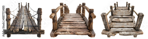 © Sandra Chia, Obraz premium Set collection of arch rustic wooden wood suspended rope suspension bridge entrance footbridge boardwalk on transparent cutout PNG file. Many different assorted style. Mockup template for design