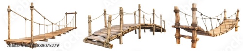 Naklejka premium Set collection of arch rustic wooden wood suspended rope suspension bridge footbridge boardwalk side view on transparent cutout PNG file. Many different style. Mockup template for design