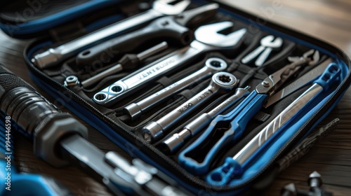 Fototapeta premium Set collection of blue screwdriver work tool in open case on the wooden table closeup, handyman home repair kit toolbox