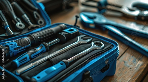 Fototapeta premium Set collection of blue screwdriver work tool in open case on the wooden table closeup, handyman home repair kit toolbox