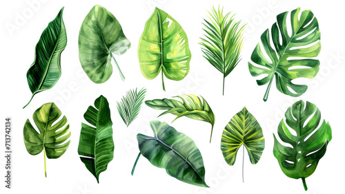 Obraz premium Set Collection Watercolor tropical leaves Modern green tropical leaves, clip art Botanical Illustration elegant watercolor illustration , green tropical leaves isolated transparent background, PNG