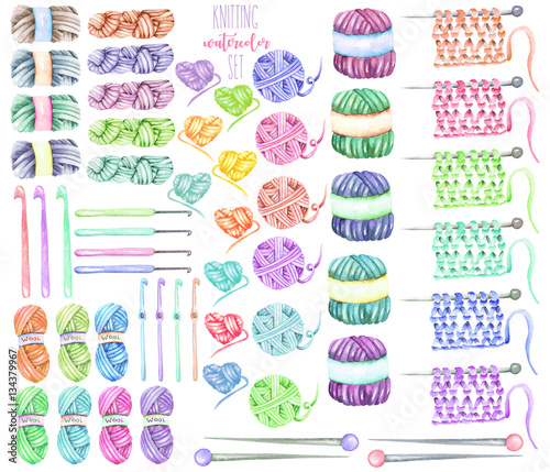 © nastyasklyarova, Fototapeta premium Set, collection with watercolor knitting elements: yarn, knitting needles and crochet hooks; hand drawn isolated on a white background