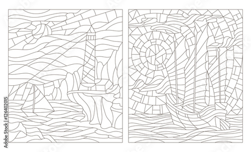 © Zagory, Obraz premium Set contour illustrations of seascapes, dark outline on a white background