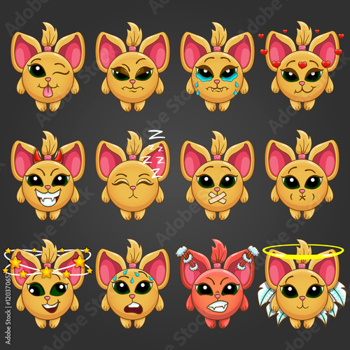© rybakova85, Fototapeta premium Set cute cartoon fantastic animal like a cat with different emot