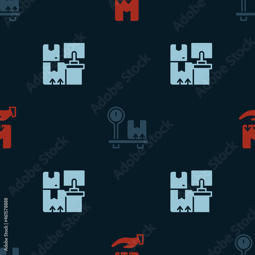 Obraz premium Set Delivery hand with box, Scale cardboard and Warehouse boxes on seamless pattern. Vector