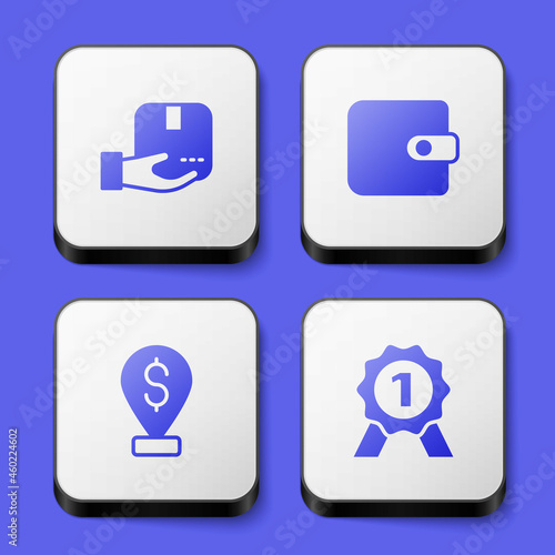 Obraz premium Set Delivery hand with box, Wallet, Cash location pin and Medal icon. White square button. Vector
