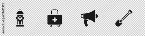 Obraz premium Set Fire hydrant, First aid kit, Megaphone and shovel icon. Vector