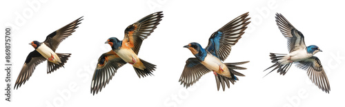 Fototapeta premium Set four cutout images swallow in flight on transparent background flying...