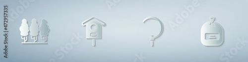 Fototapeta premium Set Fruit trees, Bird house, Sickle and Pack full of seeds. Paper art style. Vector
