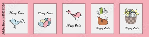Fototapeta premium Set greeting cards. Cute eggs, feather wreath, singing bird, willow and...