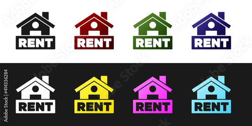 Fototapeta premium Set Hanging sign with text Rent icon isolated on black and white background. Signboard with text For Rent. Vector.