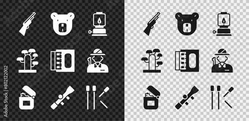 Obraz premium Set Hunting gun, Bear head, Camping lantern, Lighter, Sniper optical sight, Matches, African tree and Matchbox and matches icon. Vector