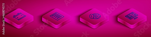© Kostiantyn, Fototapeta premium Set Isometric line Car battery, inspection, brake disk with caliper and Diagnostics condition of car icon. Vector