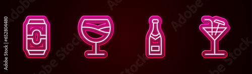 Fototapeta premium Set line Beer can, Wine glass, Champagne bottle and Cocktail. Glowing neon...