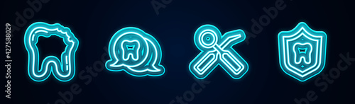 Obraz premium Set line Broken tooth, Tooth, Dental inspection mirror and protection. Glowing neon icon. Vector