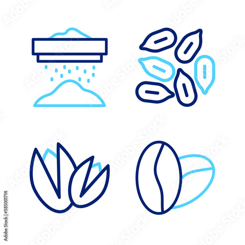 © vector_v, Naklejka premium Set line Coffee beans, Pistachio nuts, Seed and Sifting flour icon. Vector