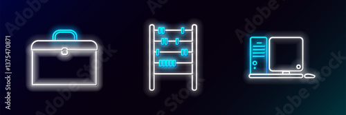 Fototapeta premium Set line Computer monitor with keyboard and mouse, Briefcase and Abacus icon. Glowing neon. Vector