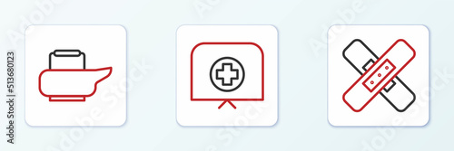 © vector_v, Obraz premium Set line Crossed bandage plaster, Bedpan and Nurse hat with cross icon. Vector