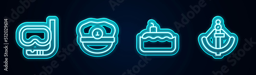 Obraz premium Set line Diving mask and snorkel, Captain hat, Submarine and Anchor. Glowing neon icon. Vector
