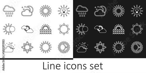 Fototapeta premium Set line Eclipse of the sun, Sun, and cloud weather, Cloud with rain, Sunset and moon stars icon. Vector