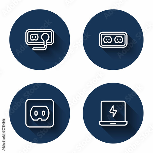 Fototapeta premium Set line Electrical outlet, and Laptop with long shadow. Blue circle button. Vector