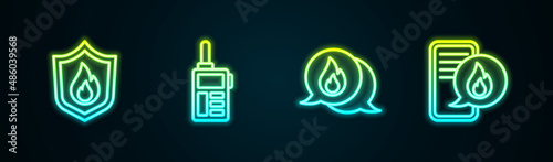 Obraz premium Set line Fire protection shield, Walkie talkie, Telephone call 911 and Phone with emergency. Glowing neon icon. Vector