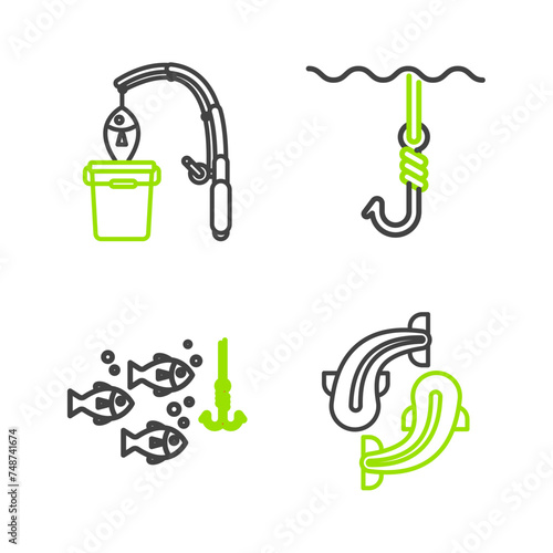 © Oksana, Obraz premium Set line Fish, Fishing hook under water with fish, and rod and icon. Vector
