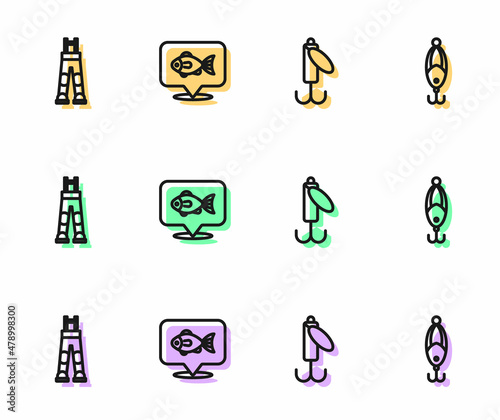 Fototapeta premium Set line Fishing lure, Fisherman pants, Location fishing and icon. Vector