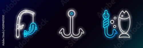 Obraz premium Set line Fishing, rod and fish and hook icon. Glowing neon. Vector