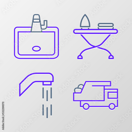© Oksana, Obraz premium Set line Garbage truck, Shower head, Iron and ironing board and Washbasin icon. Vector