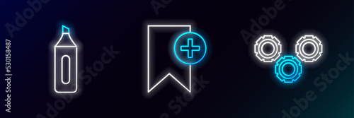 © Oksana, Fototapeta premium Set line Gear, Marker pen and Bookmark icon. Glowing neon. Vector