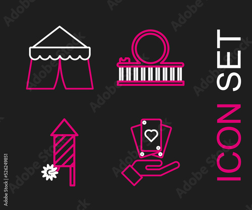 Fototapeta premium Set line Hand holding playing cards, Firework rocket, Roller coaster and Circus tent icon. Vector