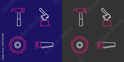Obraz premium Set line Hand saw, ircular blade, Wooden axe in stump and Hammer icon. Vector