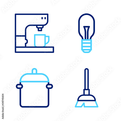 © vector_v, Fototapeta premium Set line Handle broom, Cooking pot, Light bulb and Coffee machine icon. Vector