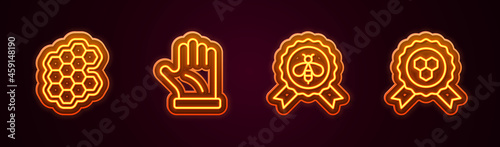 Obraz premium Set line Honeycomb, Beekeeper glove, Best bee and award. Glowing neon icon....
