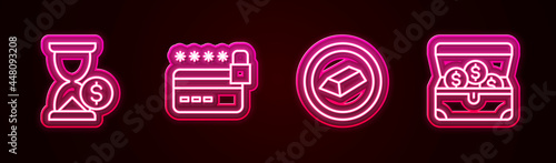 Fototapeta premium Set line Hourglass with dollar, Credit card lock, Gold bars and Treasure chest. Glowing neon icon. Vector
