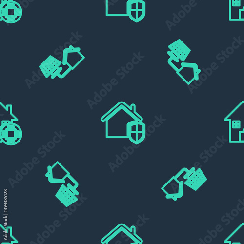 Fototapeta premium Set line House under protection, with solar panel and Smart home on seamless pattern. Vector.