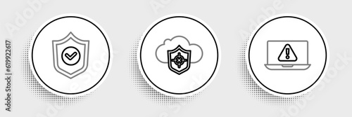 Fototapeta premium Set line Laptop with exclamation mark, Shield check and Cloud and shield icon. Vector