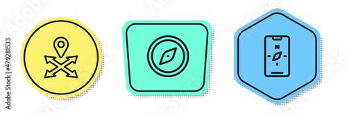 Obraz premium Set line Location, Compass and mobile. Colored shapes. Vector