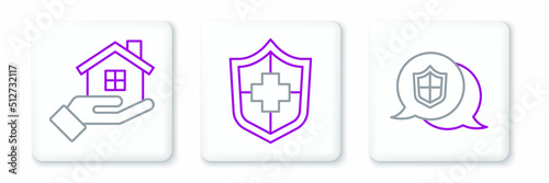 © Oksana, Obraz premium Set line Location shield, House in hand and Life insurance with icon. Vector